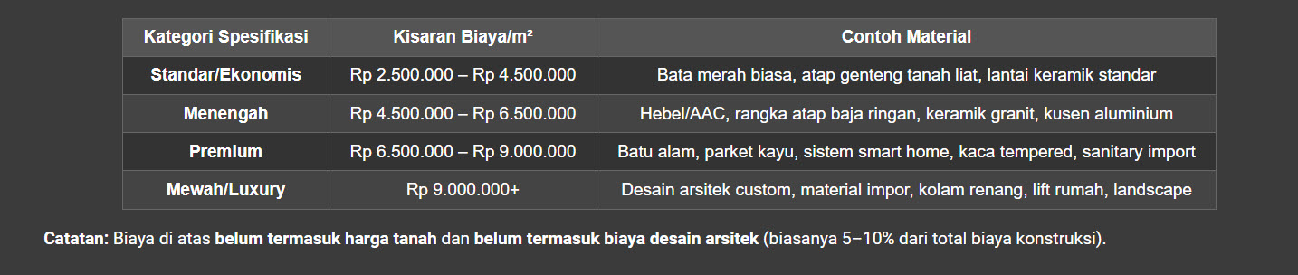 Salah satu pertanyaan paling sering dicari adalah "biaya bangun rumah per meter Bandung 2026". Berikut data estimasi berdasarkan spesifikasi bangunan: